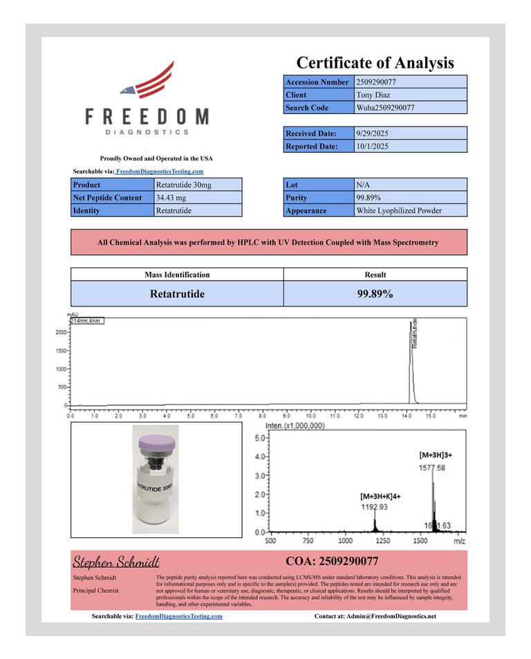 All products offered by Peptide Reserve include independent third-party Certificates of Analysis verifying purity, identity, and laboratory-grade specification. These COAs are provided solely for research and analytical reference and are not intended to imply suitability for human or animal use.